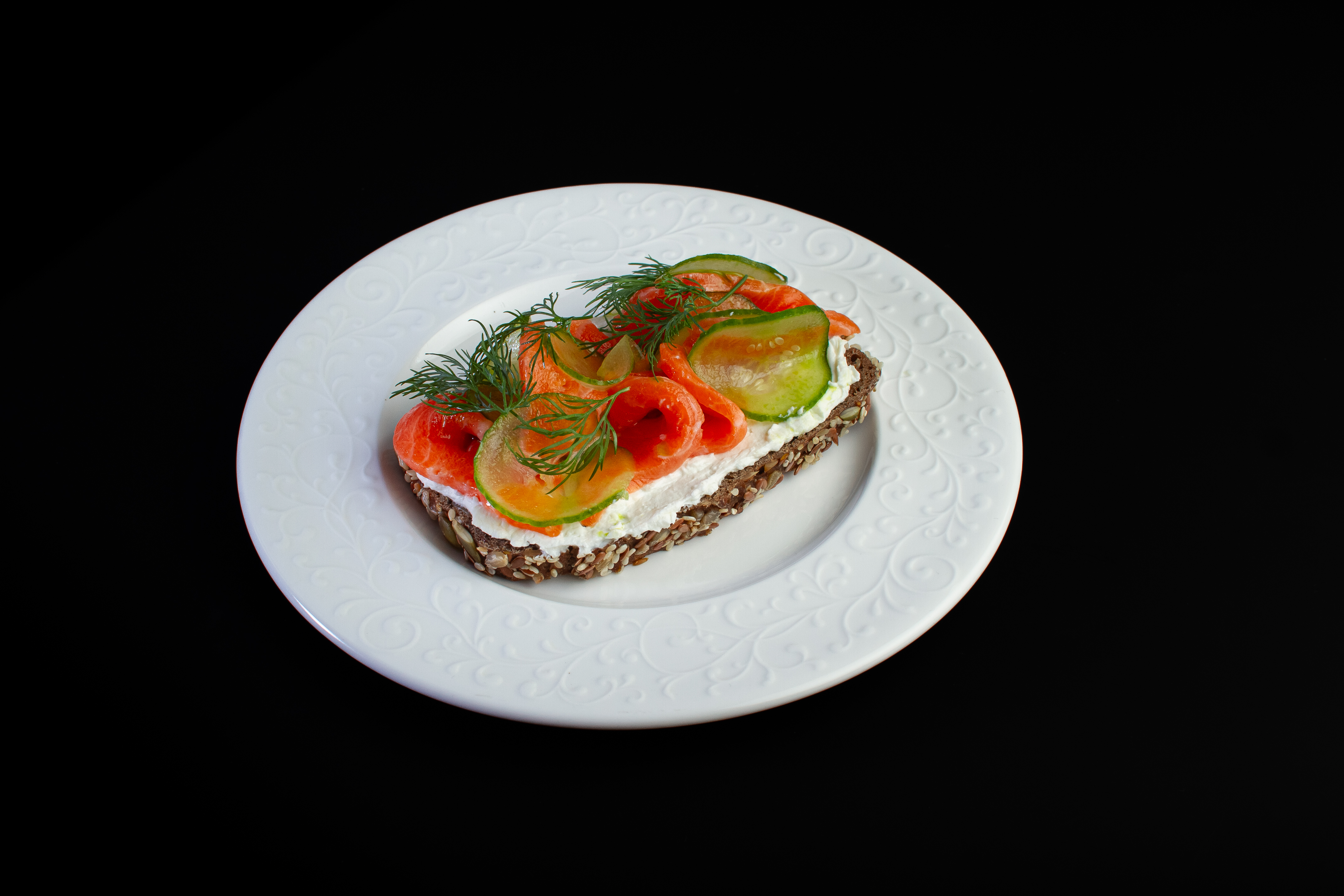 Традиционный датский бутерброд с копченой форелью и кремом из хрена