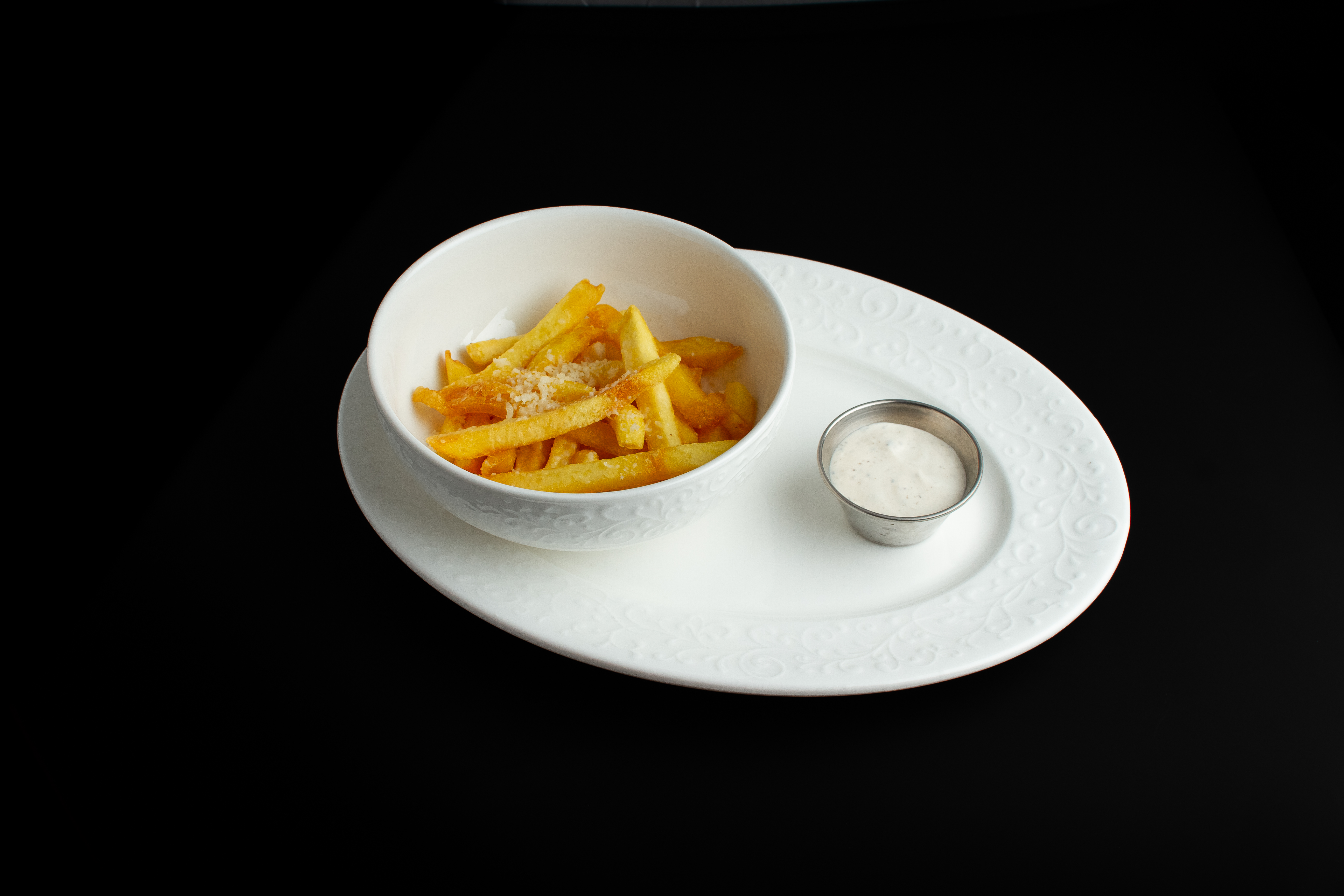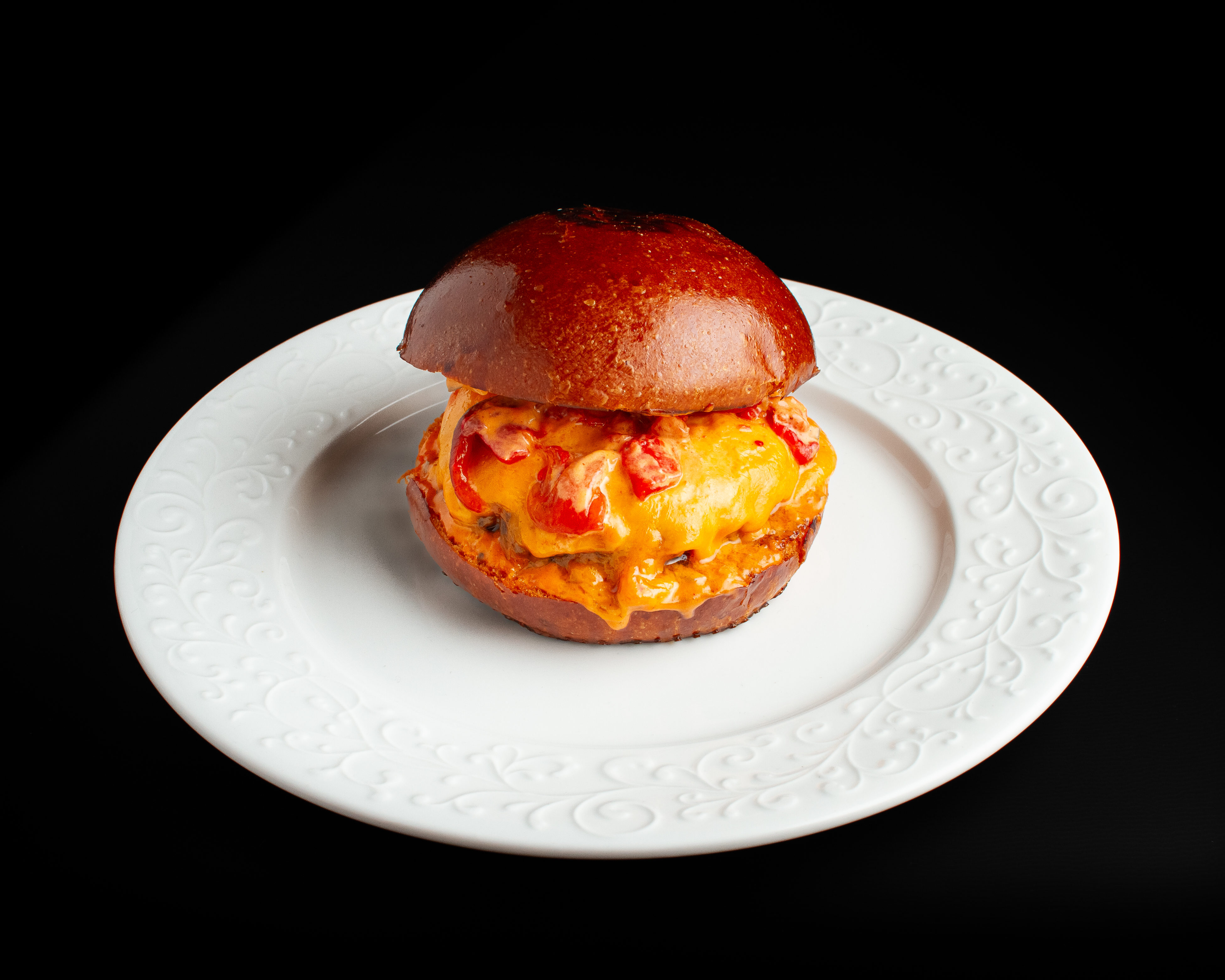 Превосходный бургер с котлетой из говядины, сыром Чеддер и перцем Рамиро, подается с картофелем фри и соусом