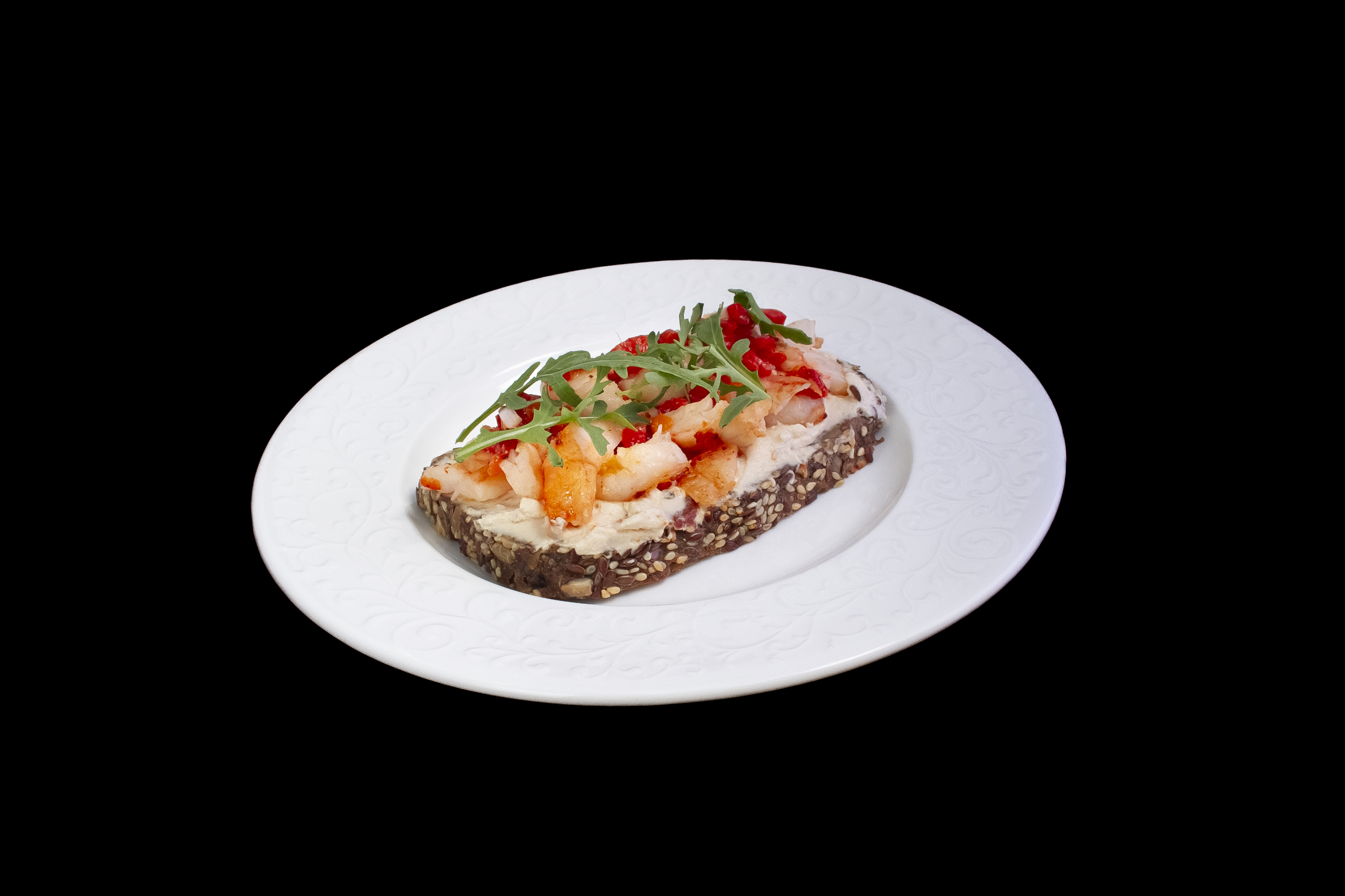 Традиционный датский бутерброд с обжаренной креветкой, перцем рамиро и кремом унаги