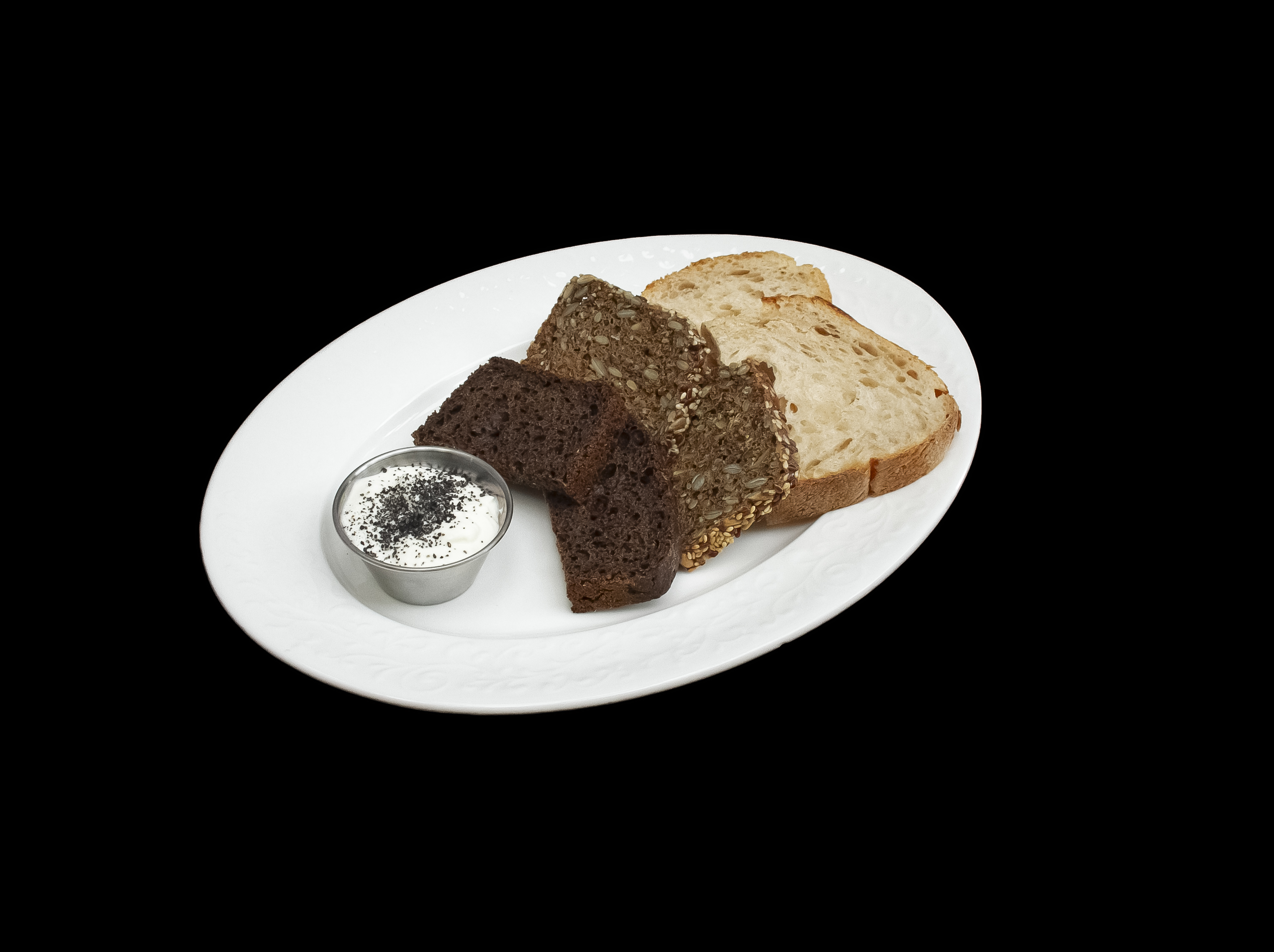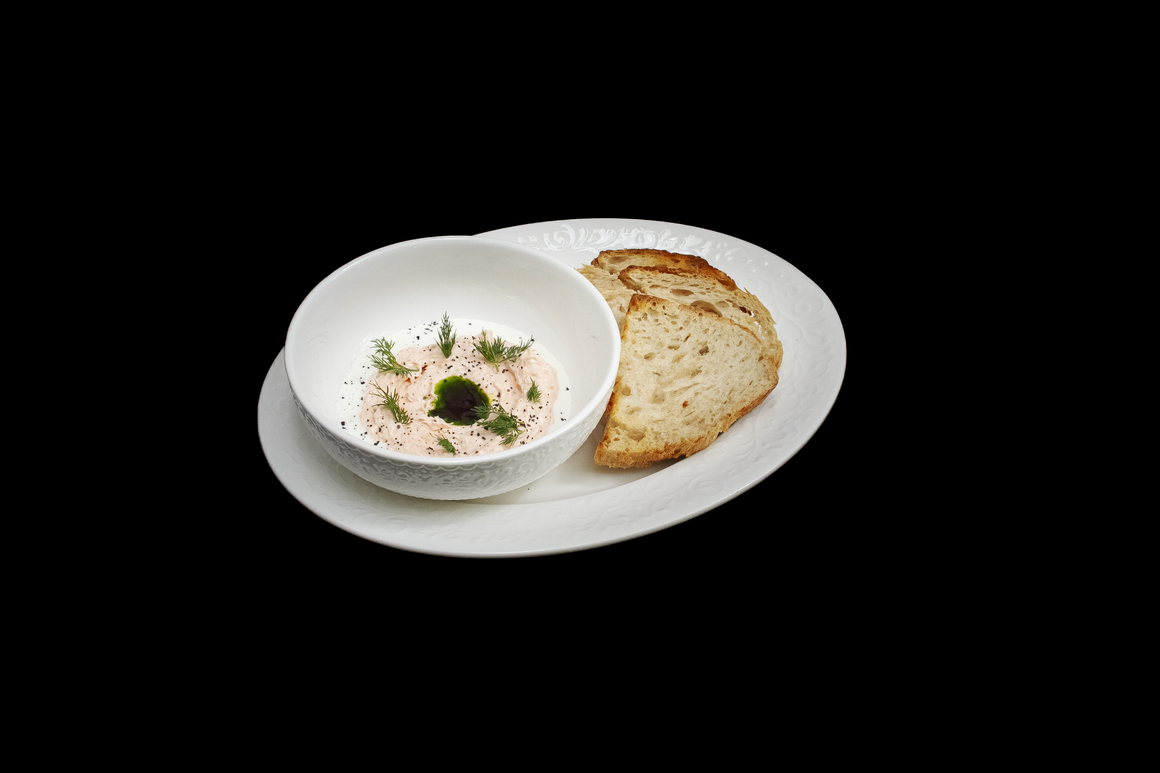 Риет из копченой форели с соусом из сливочного хрена и хлебом тартин