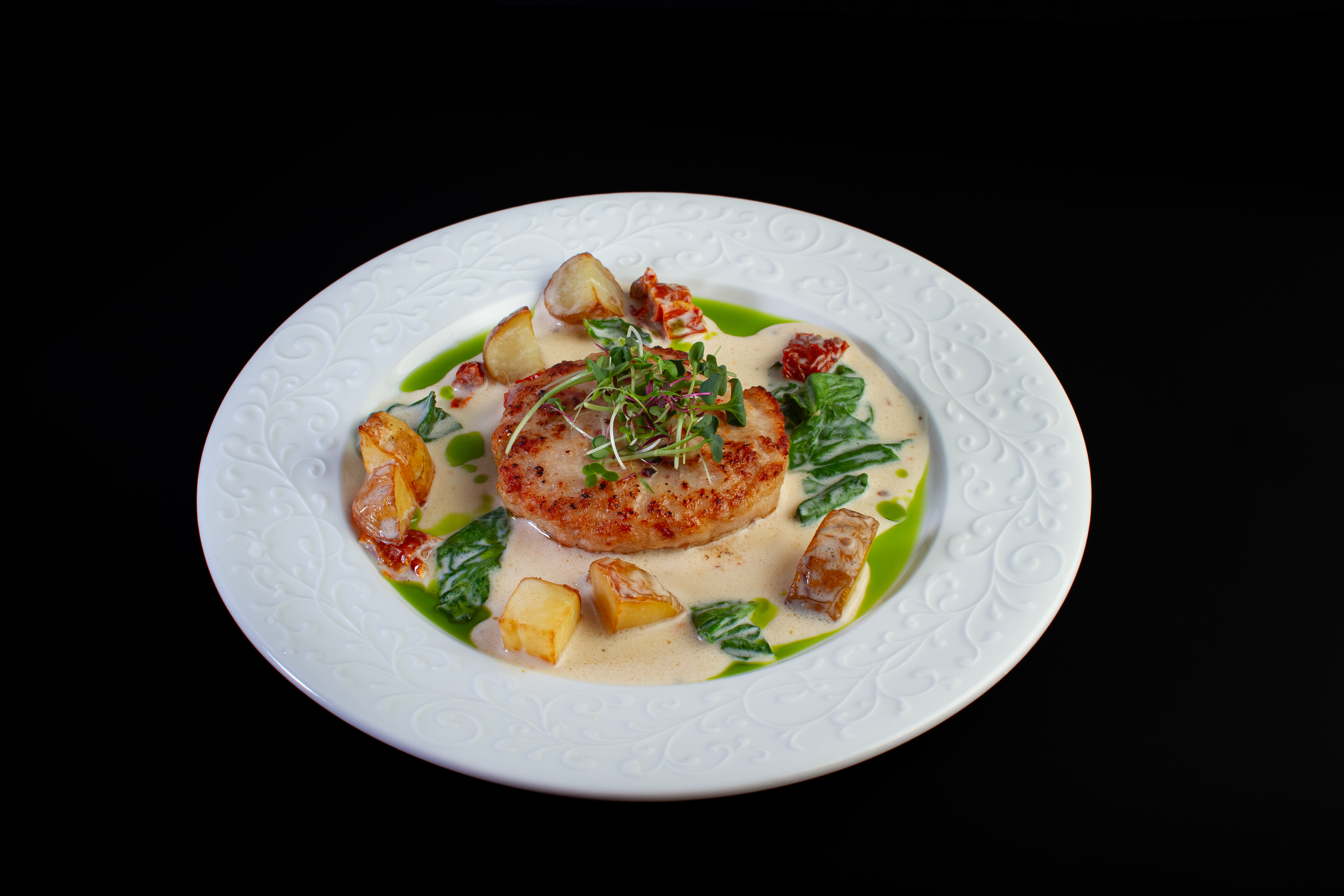 Щучья котлета с картофелем стоун, шпинатом, вялеными томатами, подается с соусом морнэ