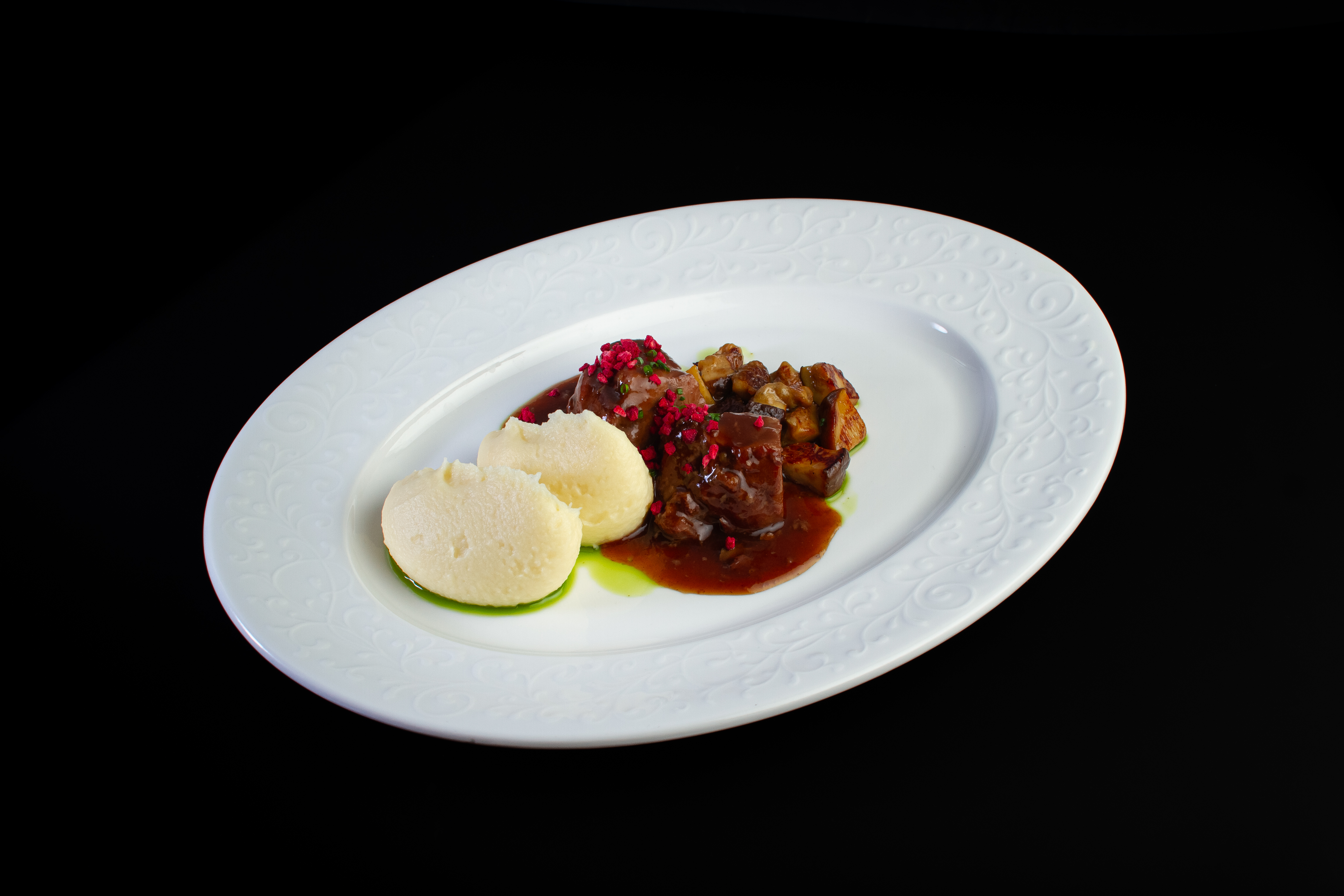 Томленые говяжьи щеки с картофельным пюре и мясным соусом кальби