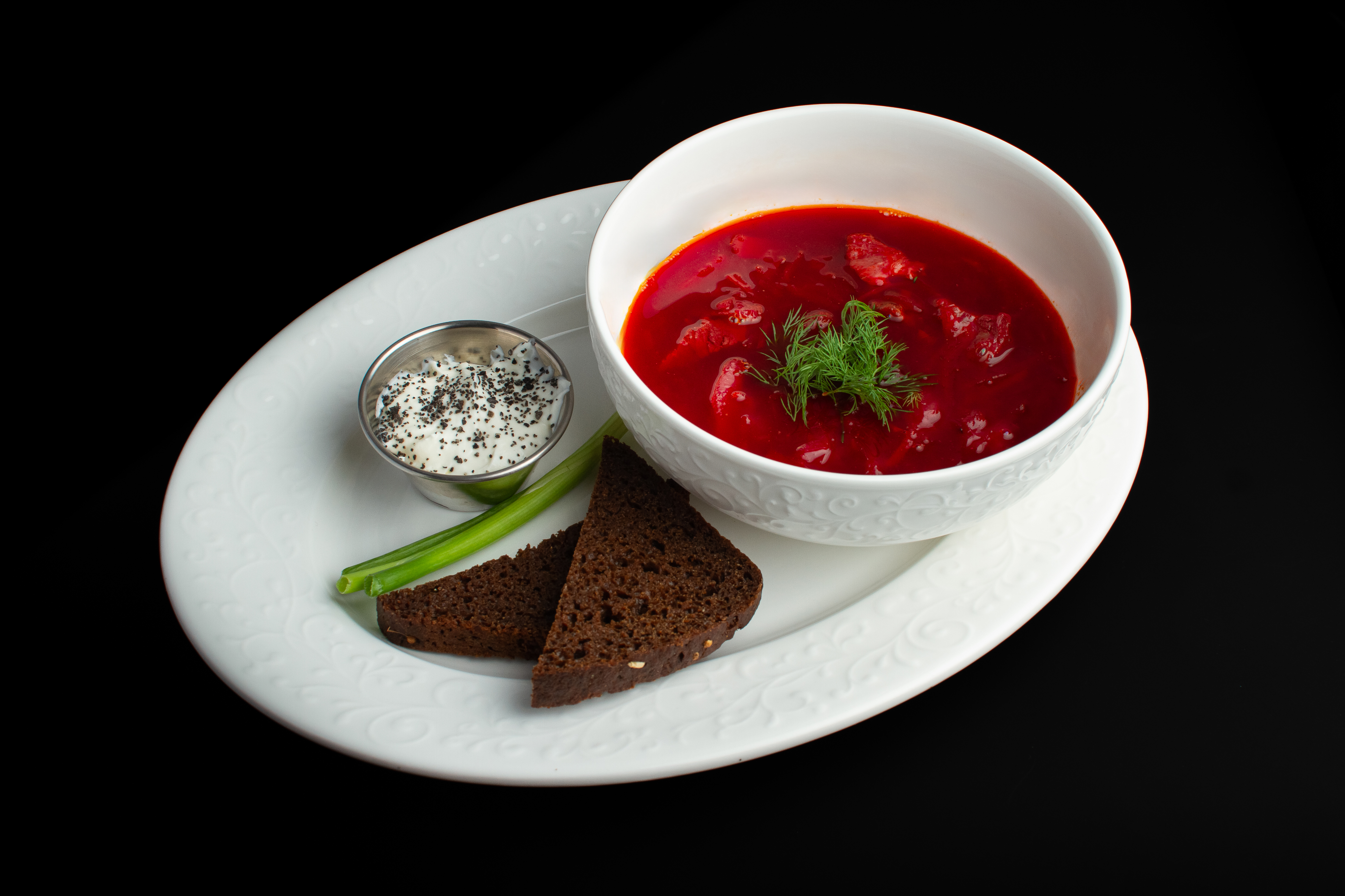 Борщ с томленой говяжьей щекой, подается с зеленым луком, сметаной и бородинским хлебом