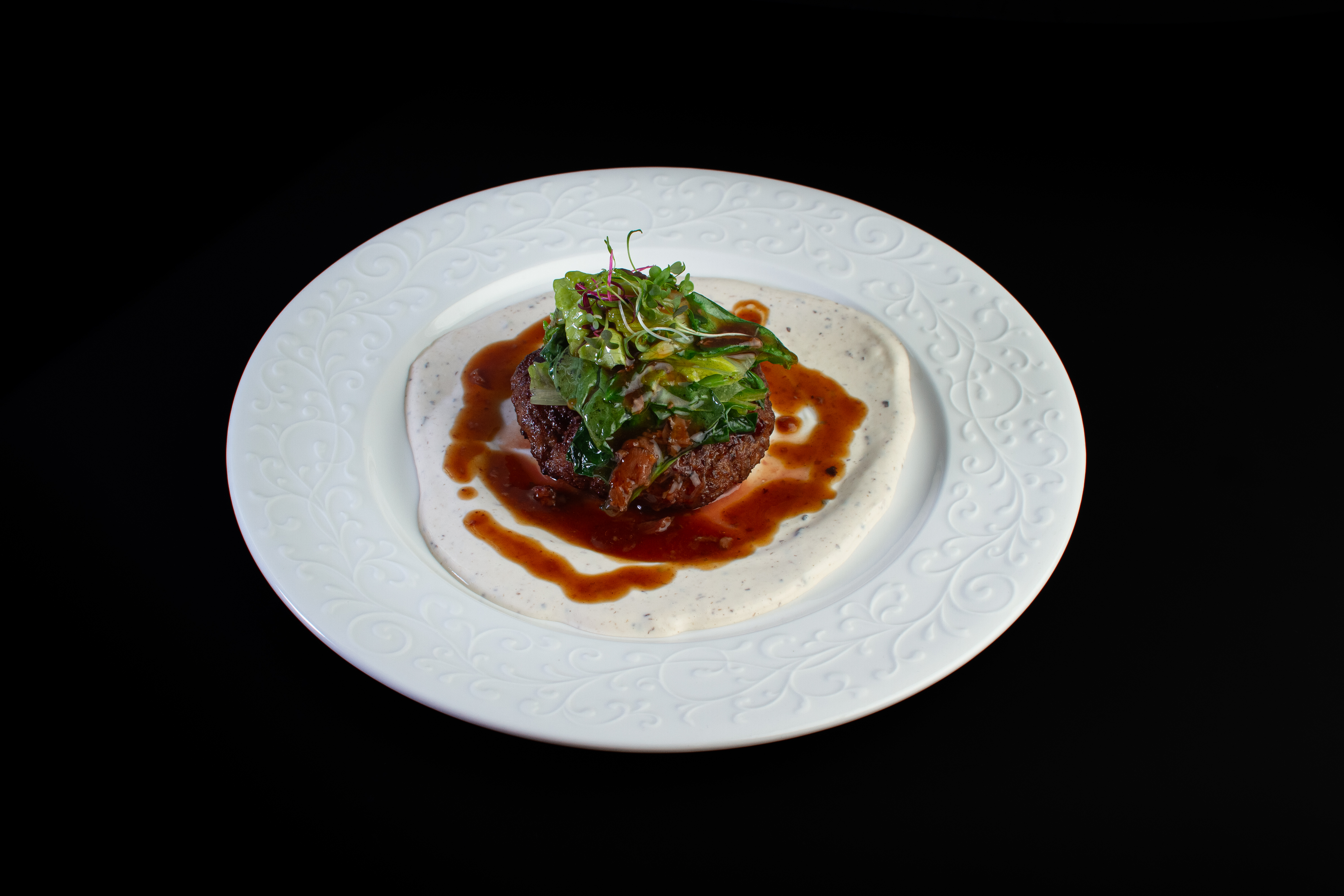 Говяжья котлета с припущенным шпинатом и ромейном, подается с соусом трюфельным соусом