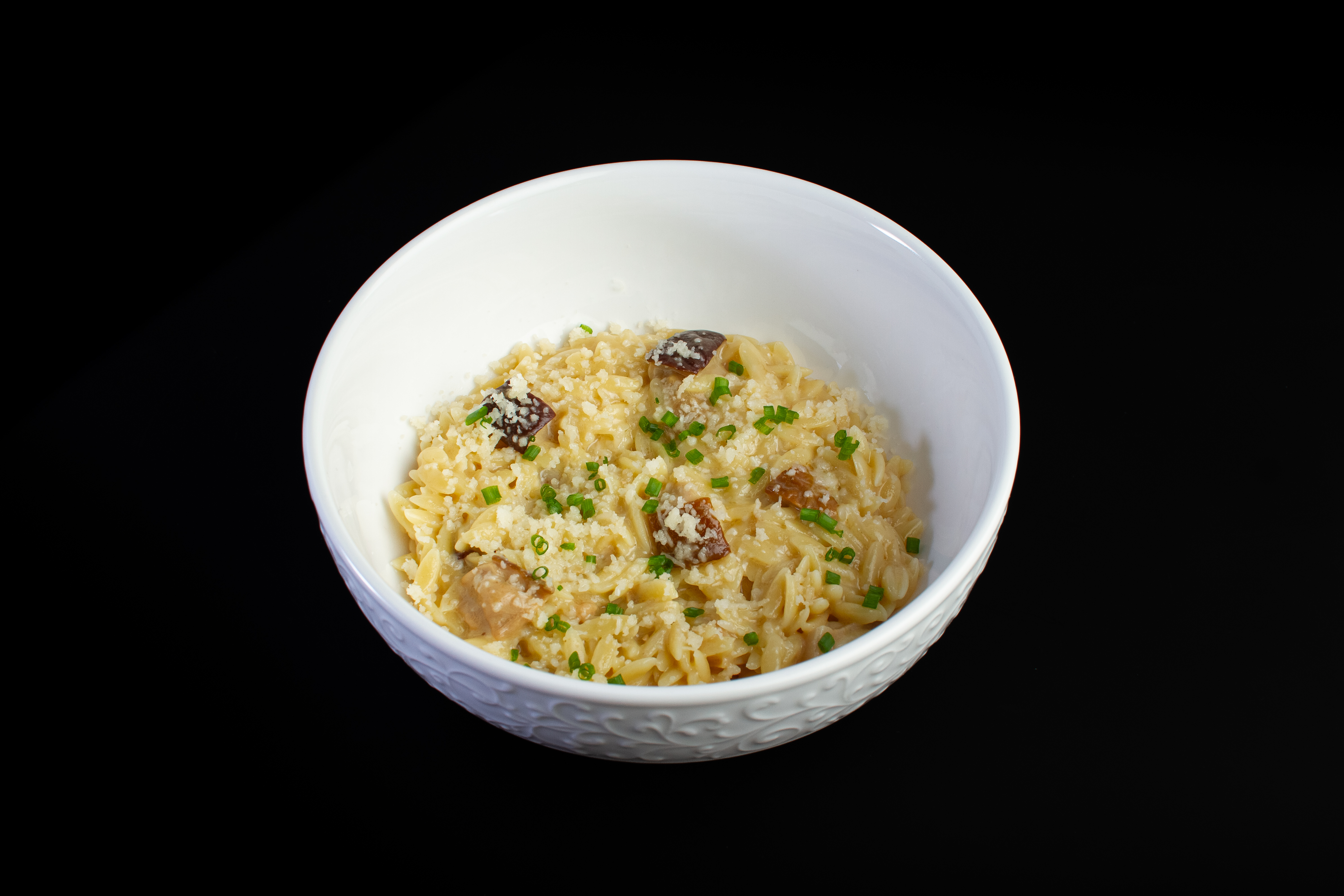 Паста, напоминающая по виду крупные зерна риса с томлеными грибами и пармезаном