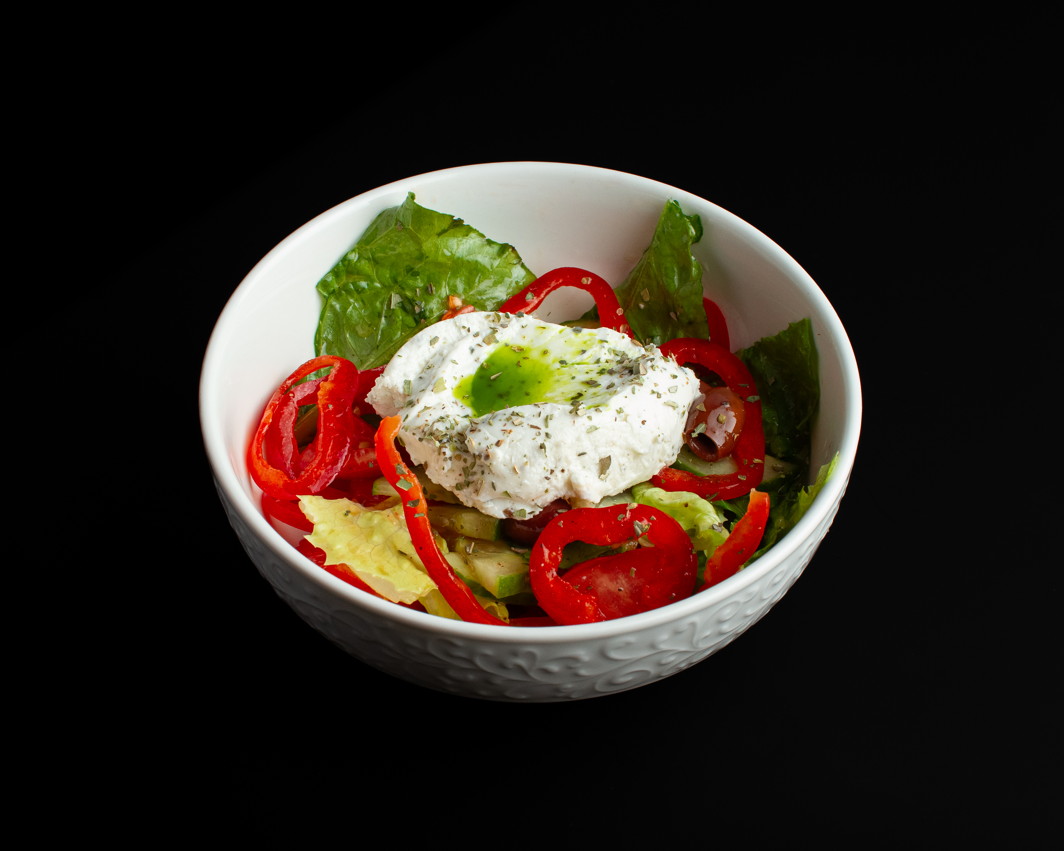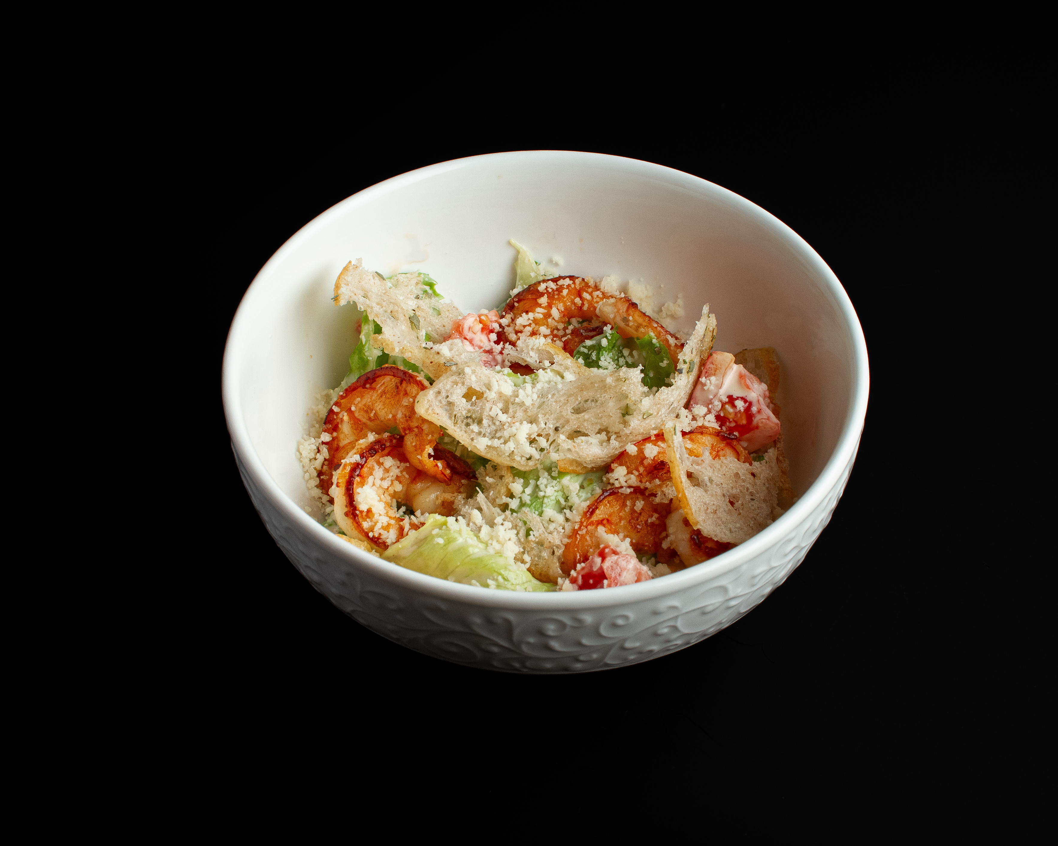 Обжаренные креветки, сочные листья салата ромейн, томаты, пармезан, гренки и пикантный соус из анчоусов