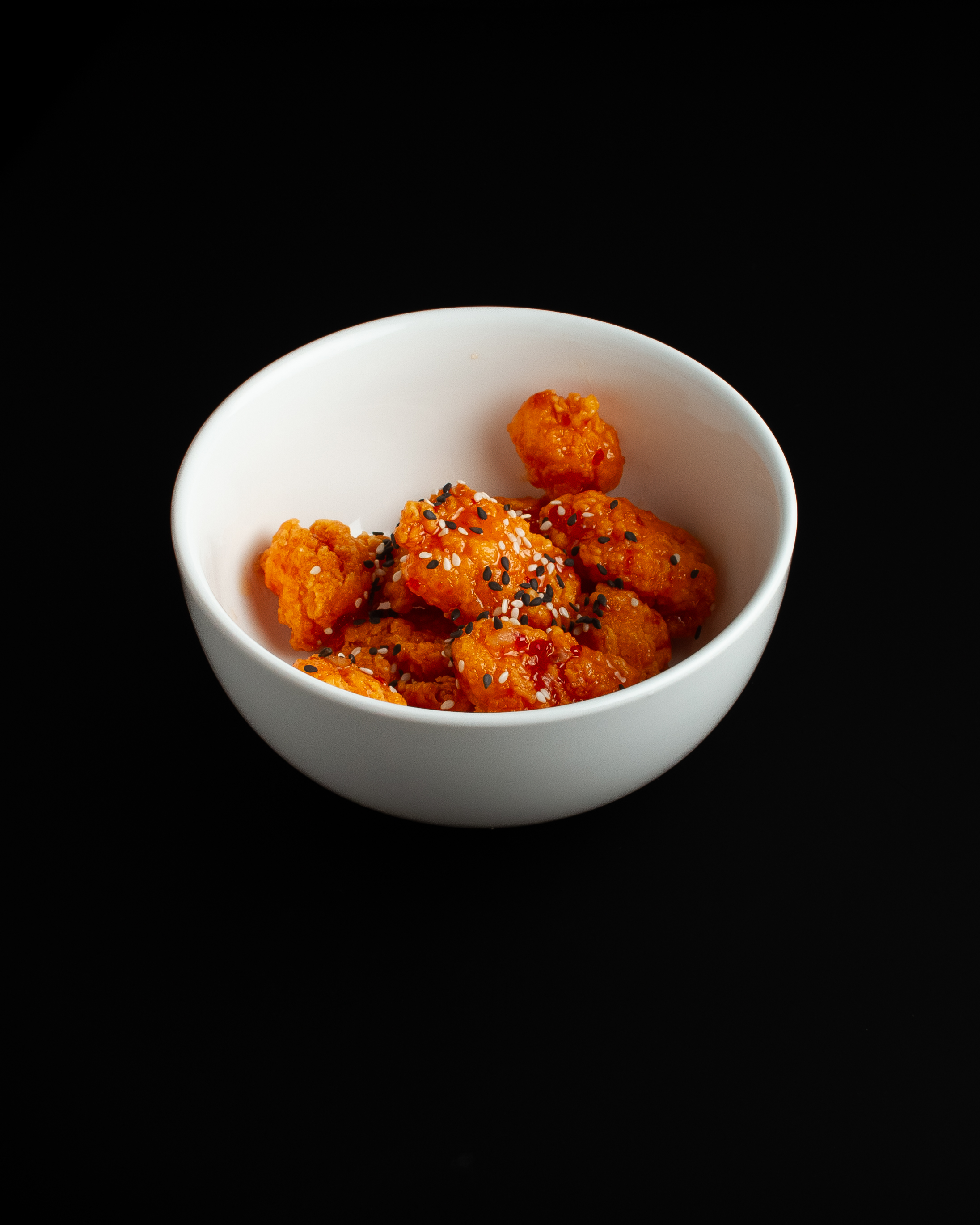 Кусочки куриного филе в панировке в азиатском соусе с кунжутом