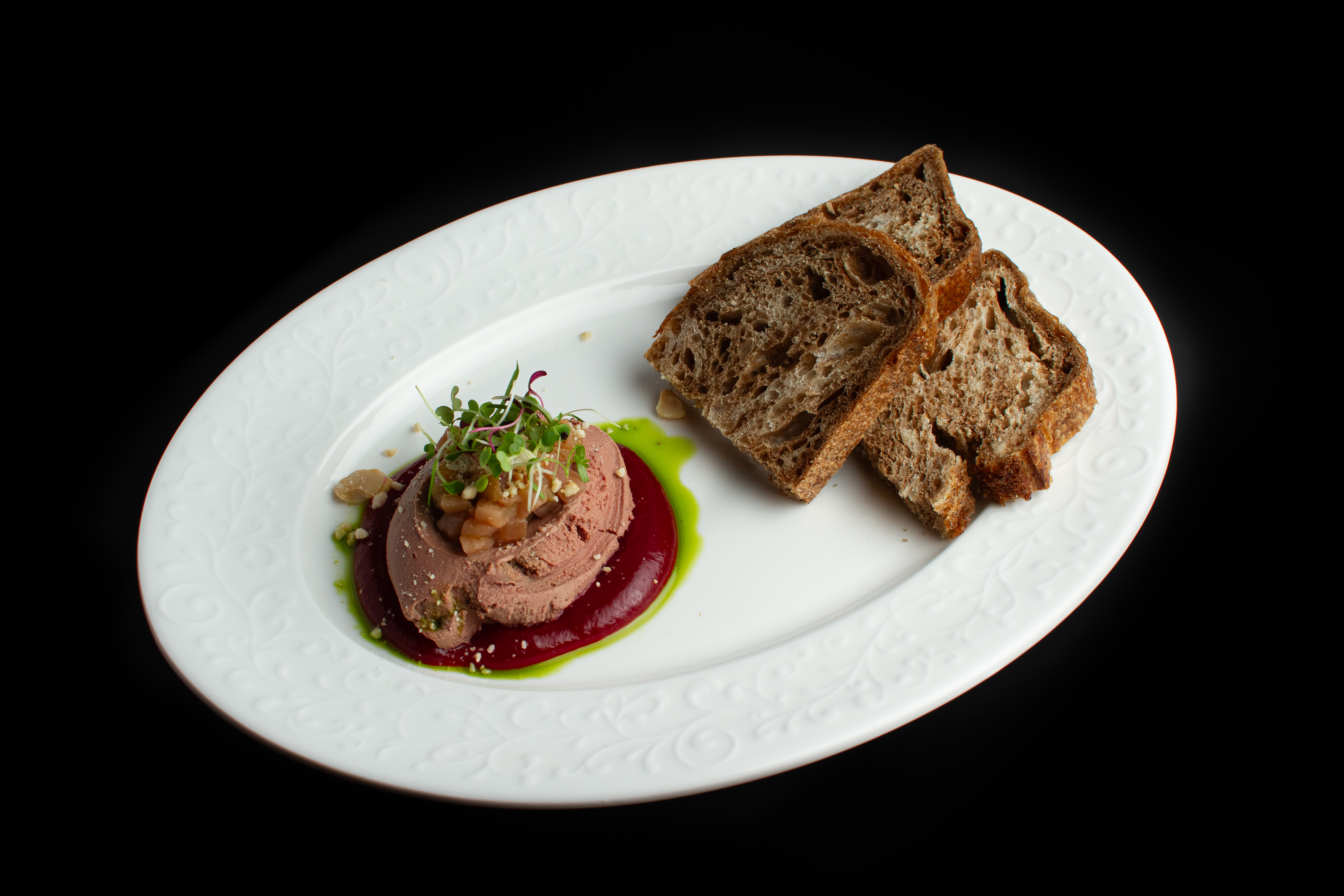 Нежный паштет из куриной печени с малиновым гелем и мостардой из яблок с кешью хлебом тартин