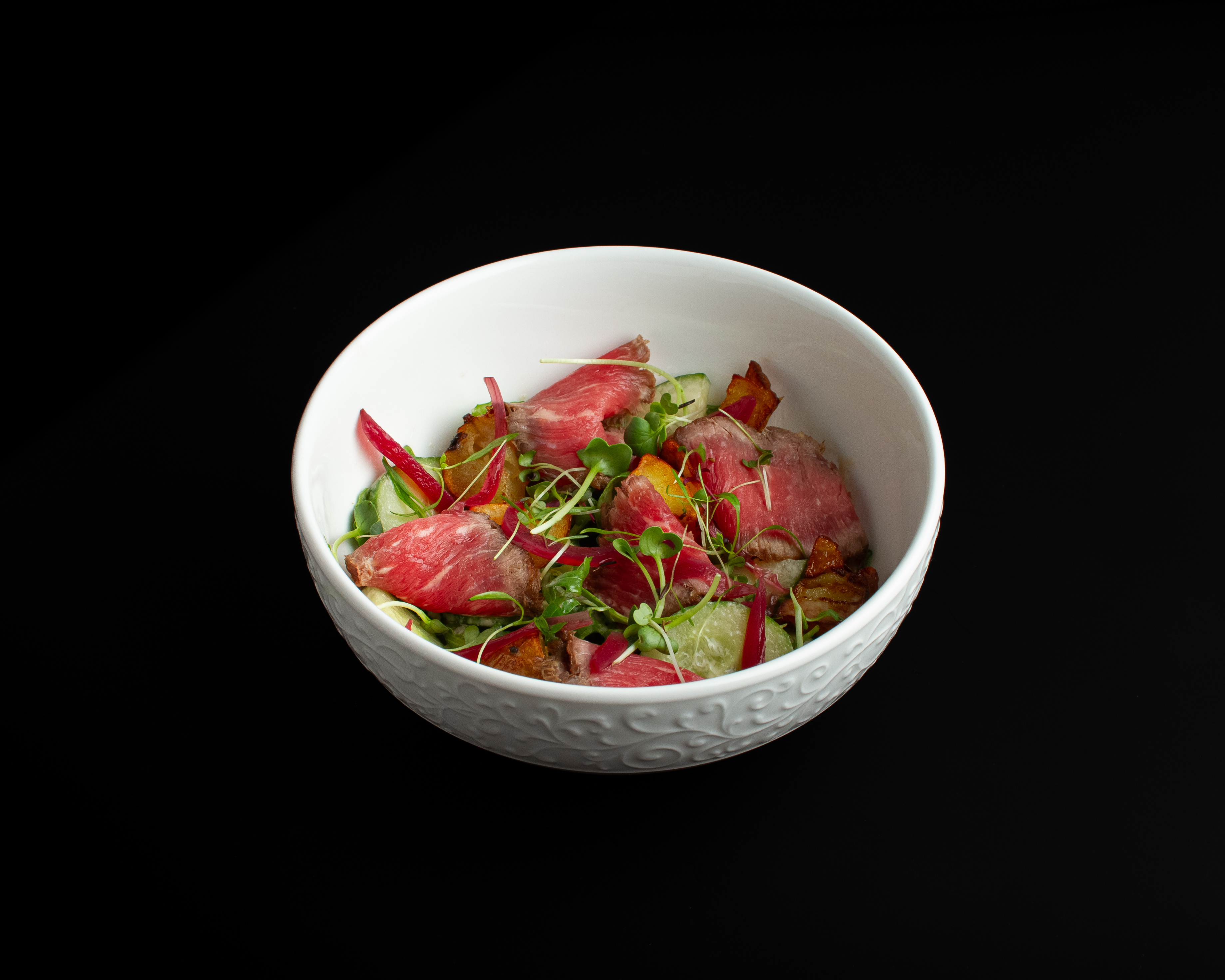 Ростбиф с картофелем стоун и рукколой, в пикатном имбирном соусе